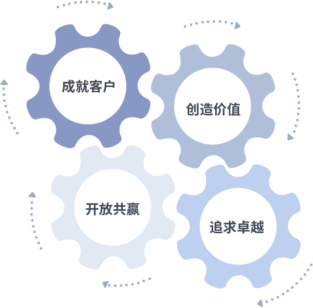 成就客户是一切决策的出发点,创造价值是衡量所有工作的标准,追求卓越是3003.com做事做人的态度,开放共赢是3003.com的格局也是最终的结果。价值观的齿轮环环相扣,推动着组织里的每个人不断向前。